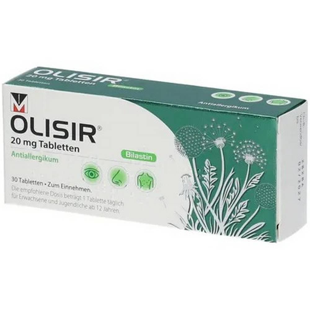 Olisir® 20 mg comprimidos es un antihistamínico que contiene el principio activo bilastina. Se utiliza para aliviar los síntomas de la fiebre del heno (estornudos, picazón, goteo nasal, congestión nasal, y ojos rojos y llorosos) y otras formas de rinitis alérgica. También se puede utilizar para tratar erupciones cutáneas con picazón (ronchas o urticaria).