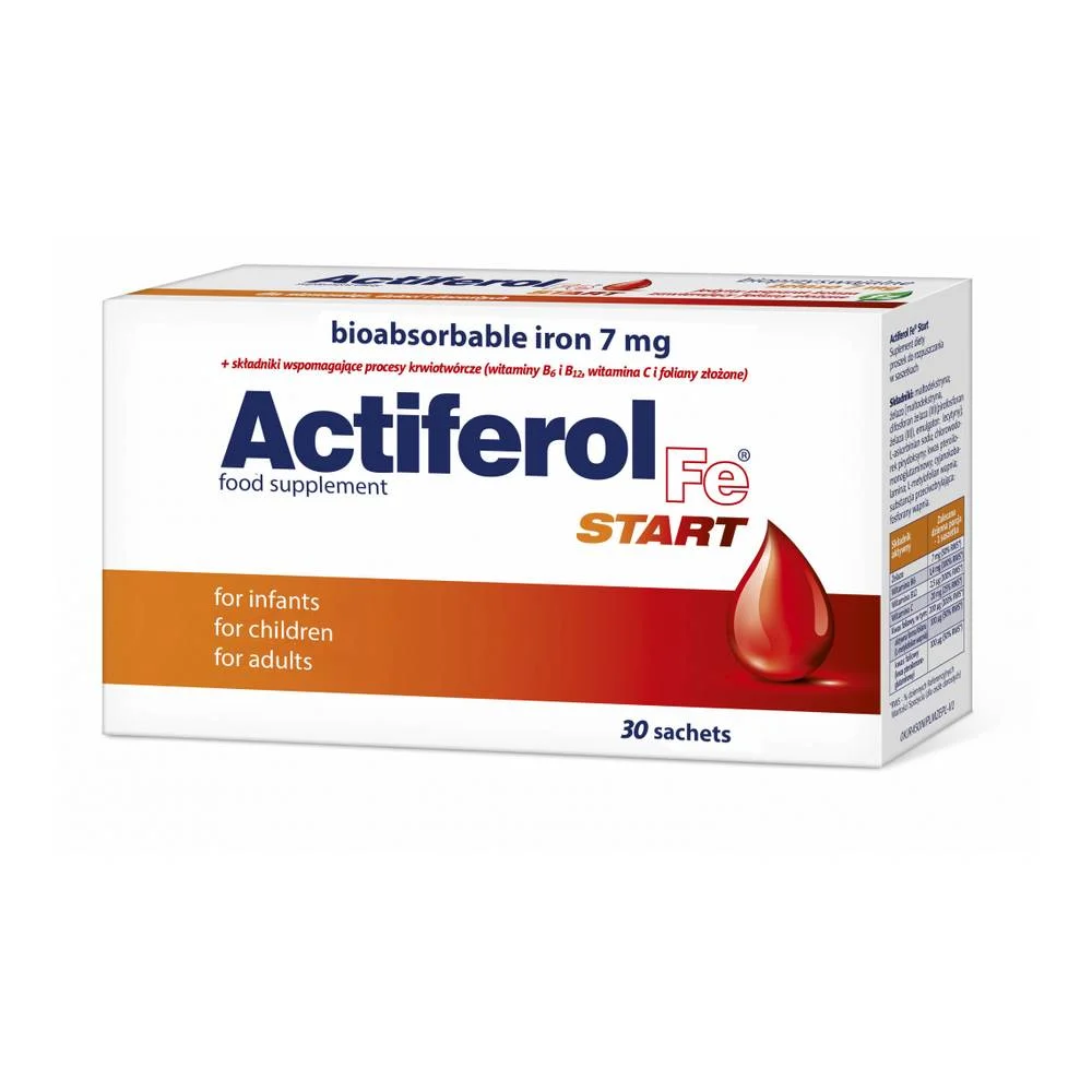 ActiFerol Fe START is a dietary supplement in convenient powder form, designed to support healthy iron levels, red blood cell production, and overall vitality. Each sachet easily dissolves in water, providing a fast and effective way to help prevent iron deficiency, reduce fatigue, and promote general wellness.