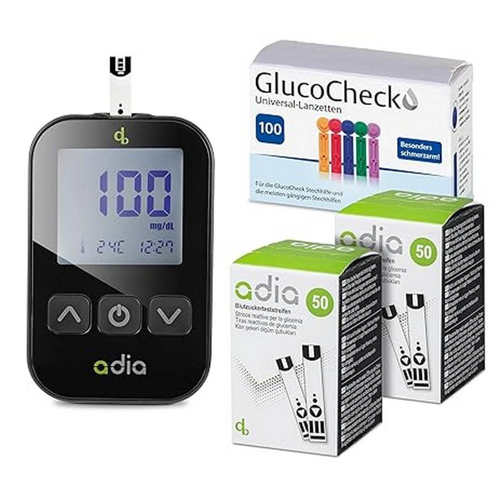 - Set Maxi Economy para diabéticos: control de la glucemia a bajo precio. Adia Blood Glucose Monitor mg (principalmente para Alemania Occidental) + 110 tiras reactivas de glucemia + 110 lancetas + dispositivo de punción + estuche + diario