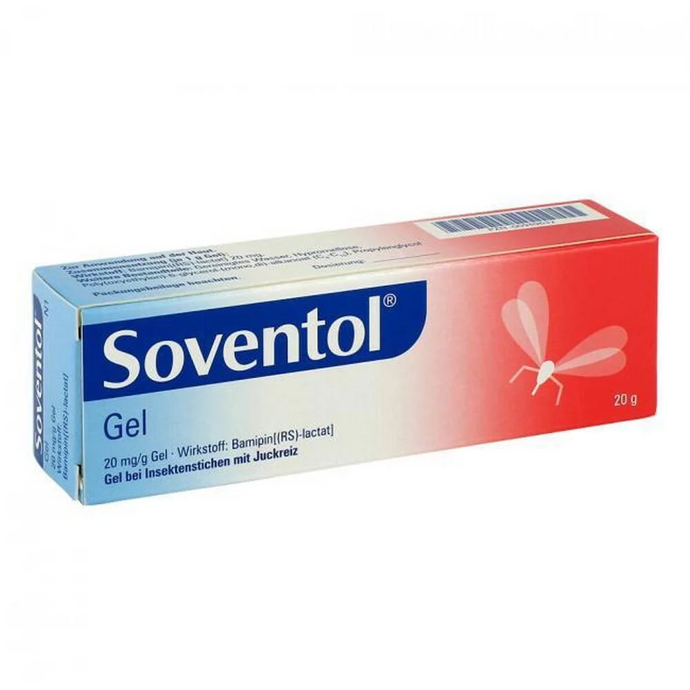Soventol HydroGel 20 g is a soothing, non-greasy gel formulated to relieve itching, redness, and swelling caused by insect bites, sunburn, and mild allergic skin reactions. Its active ingredient, bamipine lactate, provides targeted antihistamine action, helping calm the skin and promote quick relief with a pleasant cooling effect.