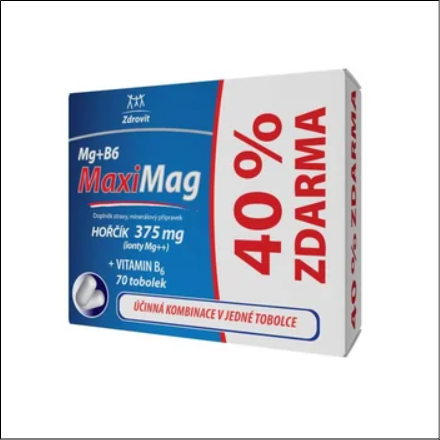 Zdrovit MaxiMag Magnesium 375 mg + Vitamin B6 – 70 capsules is a dietary supplement combining magnesium with vitamin B6. It’s formulated to support normal muscle and nerve function, energy metabolism, and overall mineral balance. The 375 mg dosage aims to help meet daily magnesium needs, while vitamin B6 improves absorption and utilization. The 70-capsule bottle is suitable for regular supplementation.